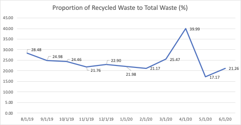 Interestingly, during the lockdown, the proportion (figure 3) and number of recycled waste (figure 4) spiked in March and April 2020. This is explained by the increase in the use of food delivery service during the lockdown for students in the dormitory and Thammasat Field Hospital. The university responded to this increase of waste from food delivery by implementing a project “Pinto Save the World”, replacing plastic packaging with food carrier (or Pinto) for food delivered to patients and medical staff in Thammasat Field Hospital, which may contribute to the reduction of recycled waste in May 2020. In contrast, the total waste sent to the municipality’s waste facility was greatly reduced due to the lock down (figure 4).
