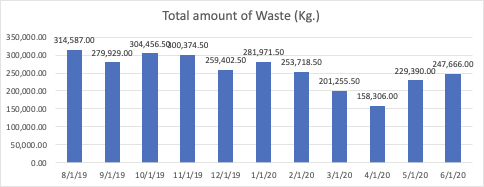 Since August 2020, the total amount of waste generated by Thammasat university gradually decreased. In the pre-lockdown period, the waste was reduced from 314,587 Kg. in August 2019 to 253,718.50 Kg in February 2020. During the lock down, the amount of waste decreased dramatically as the university was operating at the minimal level. All classes were migrated online. After the lockdown, in May and June, the amount of waste resumed its level but still less than the February-2020 level. Therefore, the overall trend of the amount of waste is decreasing, which is positive from the environmental point of view.