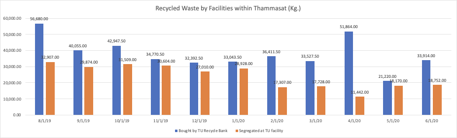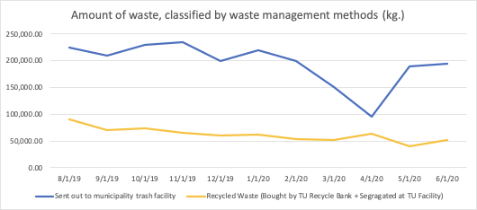 Since August 2019 – June 2020, Thammasat University has monitored the amount of waste generated by the university and how they were treated. Almost a year after implementing the waste tracking, the statistic shows that the total amount of waste generated by the university has decreased but increasing the proportion of waste recycled by Thammasat University Facilities is still a challenge.